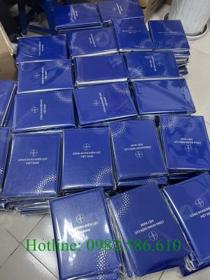 Quy cách: Sổ bìa gài + Bìa: Dập chìm logo và tên Công đoàn trên bìa da. Bên trong có ngăn để card, tai gài bút. + Ruột (200 trang – tương đương 100 tờ) trong đó: * 04 tờ Couches 200g in 04 màu 02 mặt. * Trang viết in logo và tên Công đoàn 01 màu trên giấy offset 100g nhập khẩu màu ngà vàng. (chi tiết theo maqquette được duyệt) Kích thước: 18 x 23.3 cm (sai số kích thước cho phép ±0.5cm) |